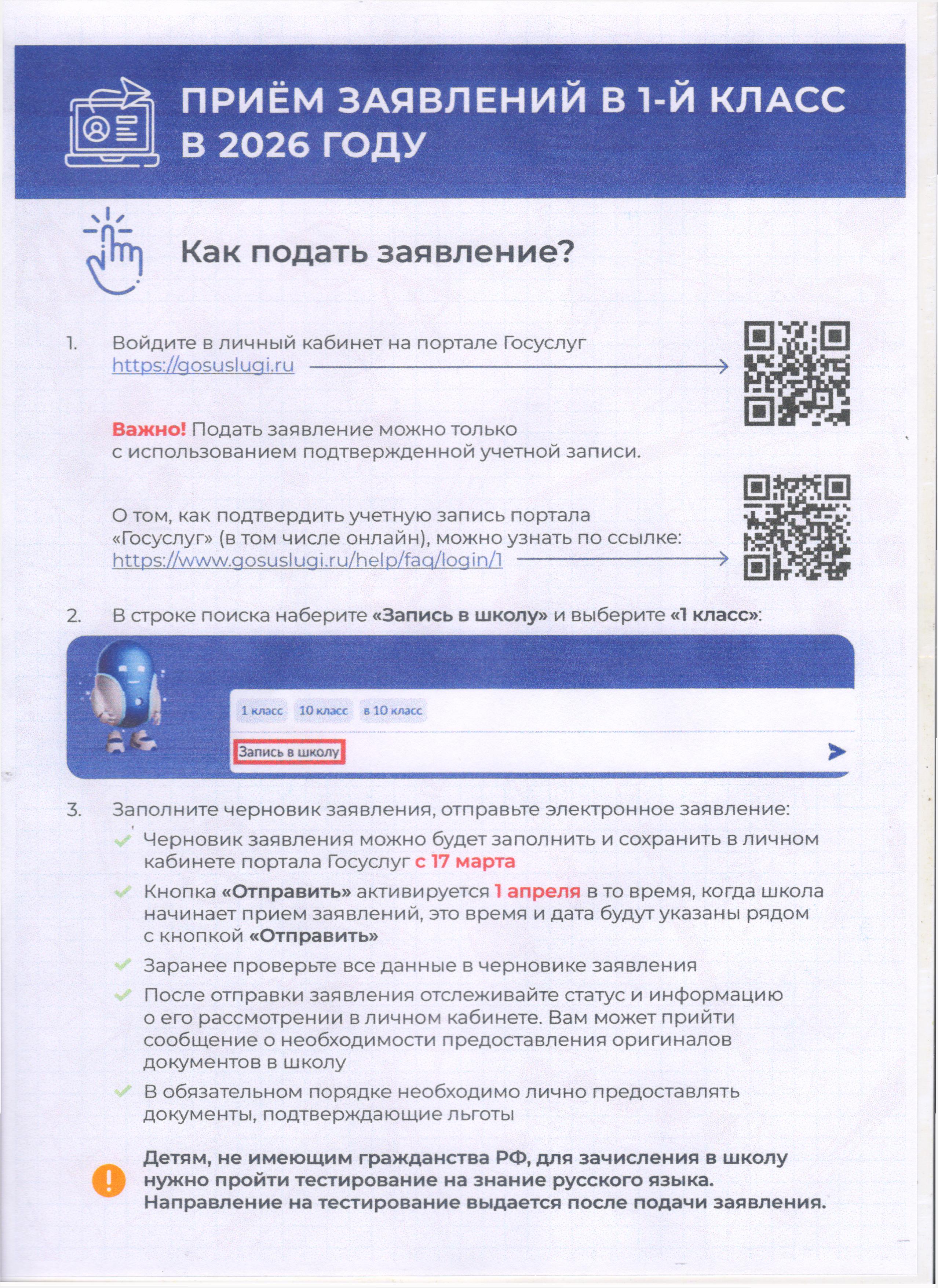 Когда и как подать заявление на зачисление в 1 класс в электронной форме в 2026 году